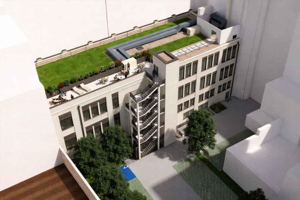 Les études ont été conduites tout au long de l’année 2025 et les travaux viennent de démarrer. Une partie du bâtiment sera démolie pour dégager de grands plateaux en open space. La façade sera entièrement repensée, un toit-terrasse créé et une cour intérieure aménagée. Au rez-de-chaussée, un espace d’accueil dédié aux locataires du bailleur complétera l’ensemble.